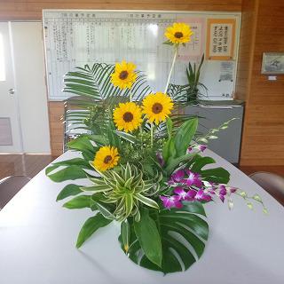 今月も盛夏にふさわしいアレンジメントが来賓玄関を飾っています。