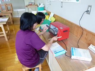 創作クラブはプラスチック板に絵を描き、トースターでチン。かわいいキーフォルダーがで出来上がり、大満足です。