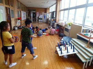 1・2年生はオープンスペースで積み木や輪投げをして遊びました。