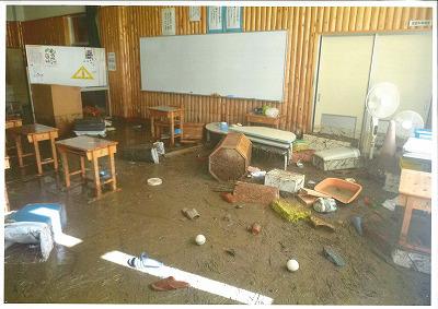 水圧で破られた職員玄関から中に一歩踏み入れた途端、足が20㎝近く泥の中に沈み込みました。やっとの思いで校内に入り目にしたのは、一階の床の全てが真っ黒の田んぼのようになり、教材・教具や子ども達の大切な学習用具が泥まみれになって散乱しているという悲惨な様子でした。この時、一階は、幾分高い所にあるし、4年前の豪雨でも浸水を免れたから今回も大丈夫ではないかと言う、かすかな望みが完全に打ち砕かれました。校内の電気、水道、電話も使えないないことも分かりました。
