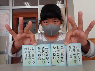 3年生は国語で「短歌を楽しもう」の学習をしています。教科書に百人一首の歌が掲載されていたので、五色百人一首に挑戦することにしました。まだ数回やっただけなのですが、3年生は今日で8首憶えてしまいました。3年生曰く、「動物や昆虫が出てくると憶えやすい」のだそうです。日本古来の言葉の美しさに、今後も触れて欲しいと思います。