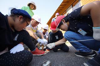 基地作りでは、4本の木に渡したロープにみんなで協力して細いロープを編み込み、その上に乗ったり寝そべったりしました。ふわふわと体が揺れるたびに大きな歓声が上がりました。