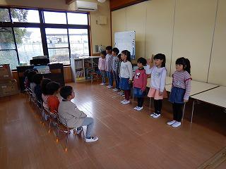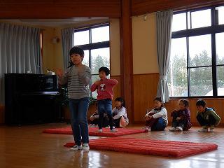 自己紹介をした後は、先日の清一祭で発表した劇「くじらぐもの上で」を披露。歌やダンス、合唱やマット運動などが盛り込んだ劇に、園児たちから「うわ~」と感嘆の声があがり、子供たちは得意顔。