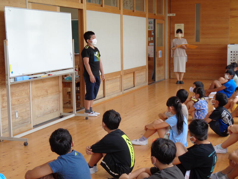 式後には、児童指導主任が、夏休み中の過ごし方について話をするとともに、運動会実行委員長と副委員長が、2学期に実施する運動会のスローガンを発表しました。