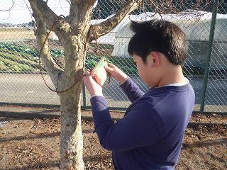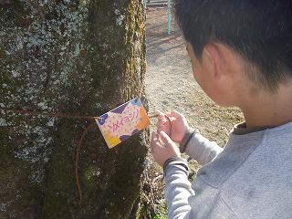 長野県のカラマツの間伐材とのことです。今回は4年生がデザインしました。カラフルで個性豊かなプレートが出来上がりました。裏面には制作者の名前もかいてあるので、記念になりますね。 くくりつけると、樹木が一層立派に見えました。