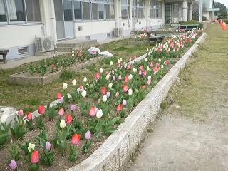 12月に、有志による奉仕作業で植えた花壇のチューリップも