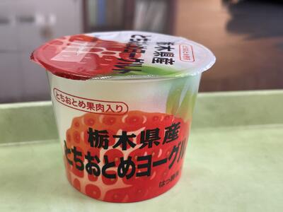 献立は、さつきの舞米粉パン、牛乳、はと麦ぞうすい、ハンバーグにらソースかけ、県産とちおとめヨーグルトです。