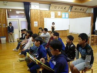 1・2年生は島村さんに「キリンですけど」と「わっしょい おじぞうさん」を、3・4年生は大牧さんに「北風と太陽」と「教室はまちがうところだ」を、5・6年生は西村さんに手塚治虫シリーズの「もえよドラゴン」を読んでもらいました。