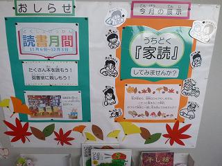 学年ごとのテーマ読書や多読賞、図書支援委員の小野先生の読み聞かせも予定されています。また、図書室には「家読(うちどく)」のお薦めコーナーが設けられています。「家読」にはきまりはありません。家族で本の読み聞かせをしたり、お薦めの本を教えてあげたり、本を話題に家族団らんができれはよいと思います。それぞれのご家庭にあった「家読」スタイルをつくってみてはいかがでしょうか。