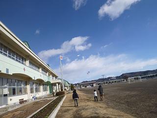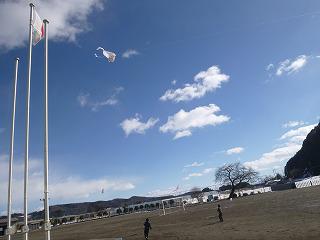 今日は太陽がでているものの寒風がふく中、1年生は自分で作った凧揚げを始めました。