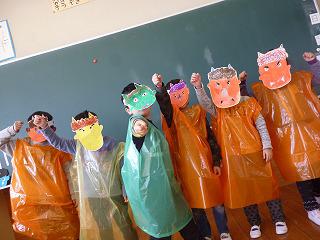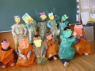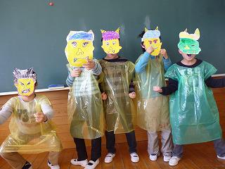 最後は、ビニール袋で作った衣装を着てお面をかぶり、鬼になりきりました。