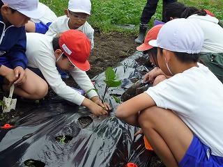今日は野菜の苗を植えました。班で話し合って決めた野菜はキュウリ、なす、ミニトマト、ピーマン、スイカ…。一本ずつ苗を植えました。