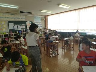 1校時の始業式では学校長から「2学期は冷房の効いた快適な環境でのスタートとなりました。学習や生活、健康について自分で立てた目標を目指してしっかり生活していきましょう。」と話がありました。その後、学級代表の子が夏休みの思い出と2学期に頑張りたいことを発表しました。「花火が楽しかった。2学期は九九名人になりたい。」「家族旅行で食べた抹茶アイスがおいしかった。たくさんプールに行った。2学期は字を丁寧に書き、漢字を覚える。」「キャンプで普段できない体験や友だちができた。算数の自主学習を頑張る。」など、しっかりとした態度で発表しました。発表を聞いていた子たちも教室に戻り、夏休みの思い出の話で盛り上がったことでしょう。