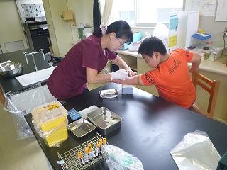 今回、採血するのが初めての子がほとんどです。ドキドキのあまり血圧が上昇した子がいました。保健衛生事業団の方が「予防注射より痛くないよ」と声をかけてくれたのでホットした表情に。少し休んでから再び血圧を測り、全員無事採血することができました。