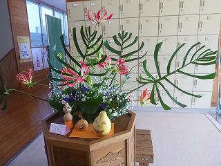 手前のひょうたんアートは教頭先生作です。親子の共演といったところでしょうか。毎回、素敵なアレンジメントフラワーに癒やされています。