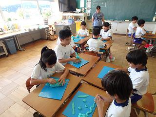 2校時、1・2・3年生は合同体育でボールを使った遊びをしました。4年生は図画工作です。音楽のイメージを粘土で表しました。5年生は外国語活動で「What would you like?」のやりとりの練習からお店屋さんごっこをしました。6年生は算数です。縮図の考えを使って校舎の高さを調べました。角度の計測が難しかったようです。