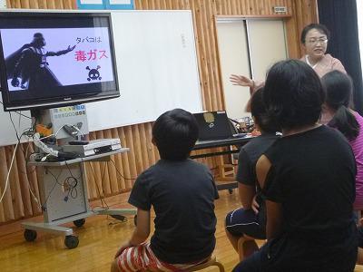 たばこは良くないもの・・・というのは何となく分かっていた児童たちでしたが、実際にたばこを長年吸っていた人の肺や心臓、歯肉の写真には「えーーっ!!」と衝撃が走ります。たばこに含まれるニコチンによる体への影響や、煙に含まれる有害物質の数の多さに、「自分の健康も、周りの人の健康も害するとても怖い物なんだ」とたばこの真実をひたむきに学んでいました。