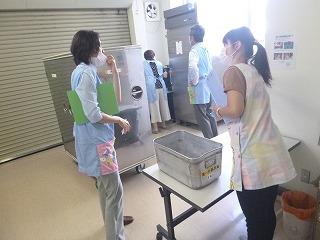 粟野調理場の場長さんと栄養職員さんの3名が来校し、給食の配膳から片付けまでの様子を見ていただきました。