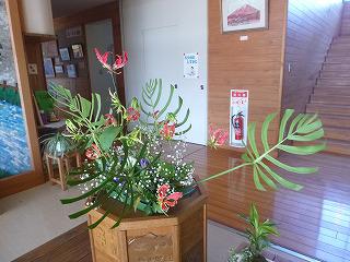 手前のひょうたんアートは教頭先生作です。親子の共演といったところでしょうか。毎回、素敵なアレンジメントフラワーに癒やされています。