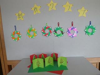創作クラブの子どもたちもクリスマス飾りを作りました。素敵な色合いの壁飾りとクリスマスツリーは立体のカードに仕上がっています。校舎内の掲示物も少しずつ年末の装いになってきました。