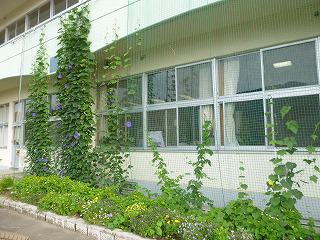 本校のグリーンカーテンは琉球あさがおがメインですが、今年はヘチマ、ゴーヤ、あさがお、フウセンカズラなども植えたので、葉っぱや花に加え実も楽しむことができました。