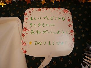 図書室のサンタさんは大きなプレゼントをかついでいます。ほしいものを書いてはると願いが叶うとのこと。ただし、一人1点だけですよ。まだ、はっていない子は図書室へ行こう!