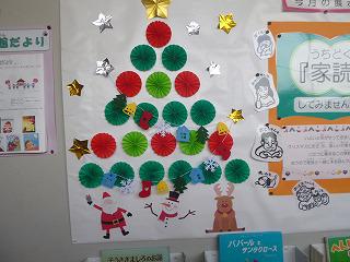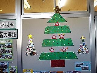 職員室前にはサンタさんツリーが現れました。サンタさんの顔も一人一人違うけど、みんな優しそう。どのサンタさんにお願いごとをかなえてもらいましょうか?