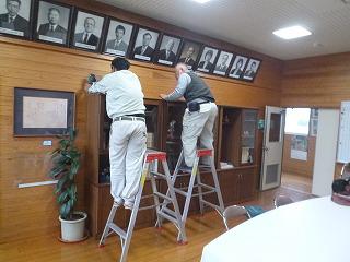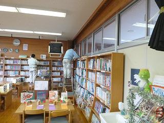 図書室で学習している時に地震がおきたら…。本棚が固定されていないため、倒れる危険性があります。今日は市の作業班の方が来てくれ、図書室と校長室の家具をL字金具でしっかり固定してくれました。