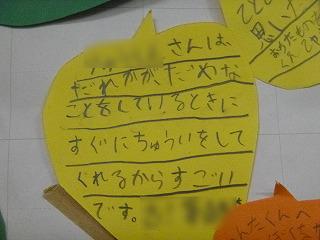 自分だったら…、最初は一人で考えました。次に仲良し班で上手に伝えられる言葉を話し合い、その場面を再現しました。どの班もBさんさんがAさんに上手に言葉をかけたので、気持ちよく教室に戻れたようです。日々の生活の中でありがちなことだけに、みんな身近に感じていたようです。そんな場面があったら、今日からさっそく実行できるといいですね。
