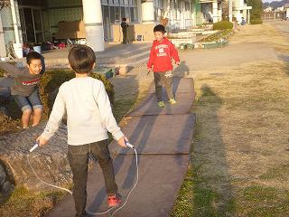 1年生から3年生は滑り台で遊んだり、縄跳びの練習をしたり、外遊びを楽しんでいました。上空には子どもたちの様子を眺めるようにゆったりと鳶が飛んでいました。