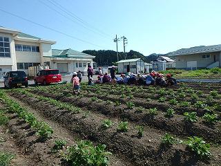 5月8日、5校時になかよし班で、サツマイモときゅうりなどの野菜の苗を植えました。
