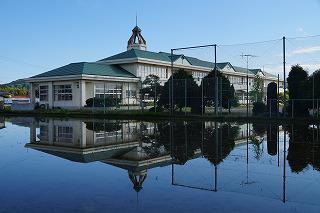 5月7日の朝、水を張った田んぼに映った清一小です。
