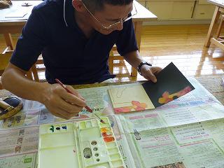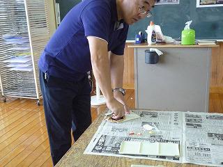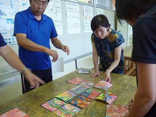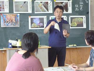 2学期に予定されている版画の授業に備えて、夏休みに一版多色刷りという技法の校内研修を行いました。