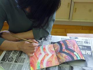 次に線の回りの部分に絵の具を少しずつのせては バレンを使い黒い紙に刷っていきます。