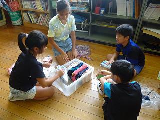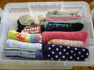 家庭から持ち寄った衣類やタオルなどを、グループごとに、分類して取り出しやすく衣装ケースに整とんしました。