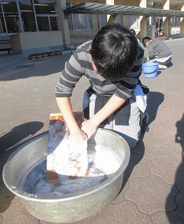 社会の「古い道具を使っていたころのくらし」の学習の導入で、洗濯板とたらいを使った洗濯をしました。