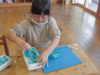 みんなで机をくっつけ合って、粘土遊びをしていました。