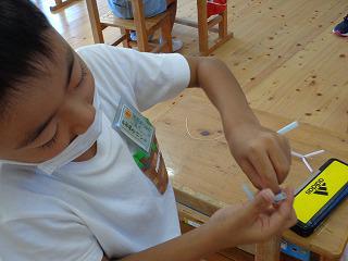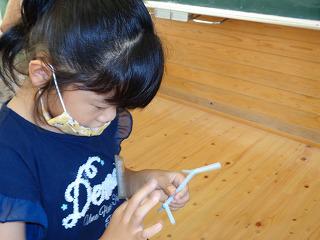 1・2年生は9月29日に「子ども総合科学館」に遠足に行きます。8月の科学館では「工作のテイクアウトスペシャル!」と称して、家で簡単に作れる工作キットを配布しています。HPには、家で簡単にできる遊びのプログラム」の掲載も。2年生は、その中の一つ「パタパタ虫」を作ってみることにしました。材料はストローと輪ゴムだけ。あっという間完成です。輪ゴムをまいて離す時にちょっとしたこつがいりますが、パタパタ虫が中を舞う姿はかわいくて、大はしゃぎの子供たちでした。