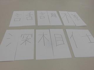 3年生は国語で「へんとつくり」の学習をしています。左右に分かれる漢字パズルを作ったので、神経衰弱の要領で先生と勝負することに。「あれ、さんずいのカードさっき出たはず。」「ん?にんべんのカードはどこだったっけ。」と、先生があたふたするのを尻目に、何の迷いもなくカードをめくる3年生。結果はもちろん10組対6組で、3年生の勝利。次は、いとへんカード、てへんカードを追加して勝負する事になっています。カードが増えて、リベンジなるのでしょうか、、、。