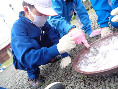 土鍋に塩がこびりついてきたら、スプーンでこすってはがします。どの班も根気よくひたすら手を動かし、さらさらでミネラル分が豊富な美味しい塩がたくさんとれました。