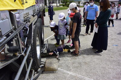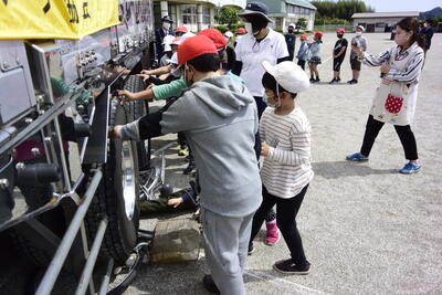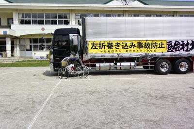 最初に、トラック協会の方が実際に大型トラックを運転して、タイヤの内輪差による巻き込み事故の様子を見せてくださいました。あっという間に大きな音を立ててタイヤの下敷きになる自転車と人形。運転している人は、自転車や人形を轢いた音も衝撃も感じないという話にも驚きました。事故の様子を間近で見たり、大きなタイヤを触ったり、トラックの運転席から外がどのように見えているかの体験もさせていただきました。