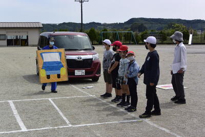 その後、模擬道路を使って横断歩道の渡り方の練習をし、最後には道路に出て実際に信号のある横断歩道を渡りました。