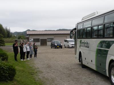 永野小の児童を乗せたバスが来たのでいよいよ出発です。朝早くからお見送りをしてくださった保護者の皆様ありがとうございました。