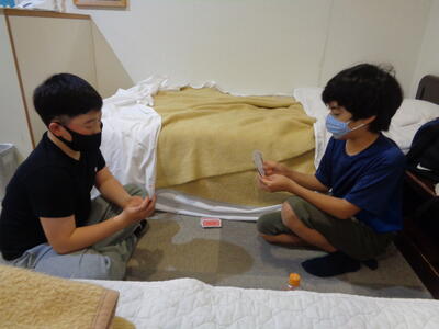 砂浜での活動を終えて風呂に入ってさっぱりし、夕食の後にナイトハイクをする予定でしたが、あいにく雨が降ってきて中止となってしまいました。その分、自分たちの部屋でゆっくりとフリータイムがとれて明日への充電がばっちりとできたようです。