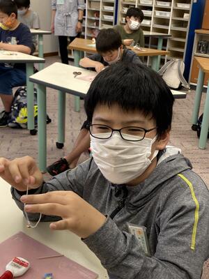 午後は、館内の学習室で貝の根付け作りをしました。貝に和柄のちりめんの布を巻き、紐を取り付けて根付け(ストラップ)にします。細かい作業に最初は苦戦していた子も、だんだんとコツを覚え、一人3個ずつの作品を完成させることができました。