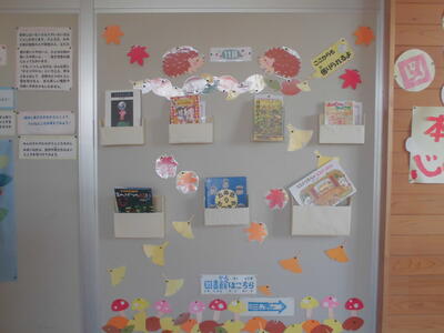 図書支援員の先生やKLVの方が、掲示物を深まる秋バージョンにして下さいました。読書をするのにも良い季節です。