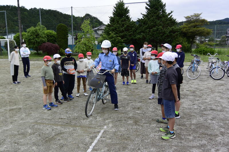 模擬道路を使い1・2年生は横断や歩行の仕方、3~6年生は自転車の乗り方について、安全確認のポイントなどについてご指導いただきました。