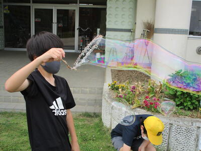 液ができたら、お楽しみのシャボン玉飛ばしタイム。毛糸を巻いたハンガーや、輪っかにしたモールでシャボン玉を作ります。大きいシャボン玉を作ったり、小さいシャボン玉を連続して作ったり、シャボン玉の中にシャボン玉を入れたりと、思い思いのシャボン玉を飛ばして大満足でした。