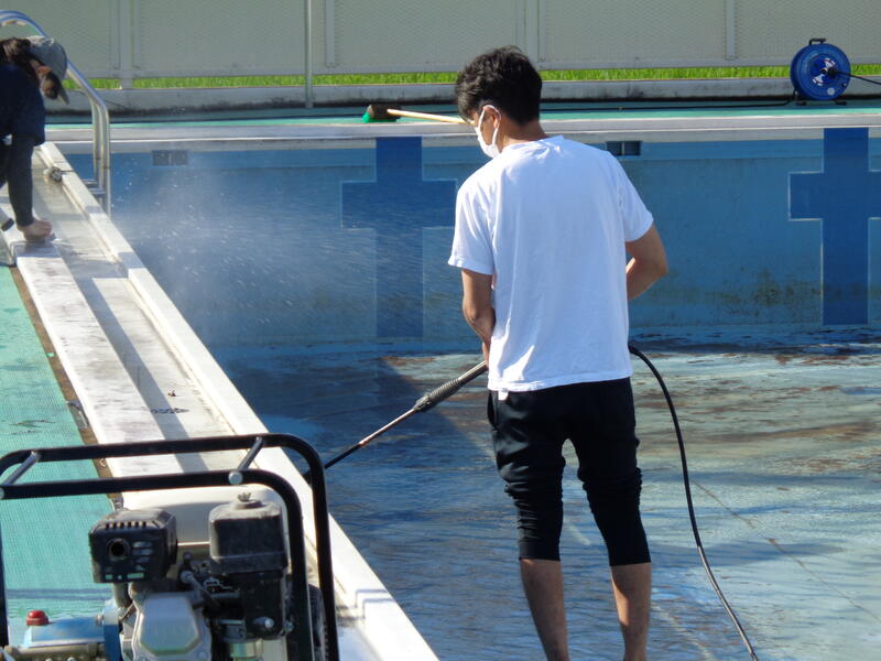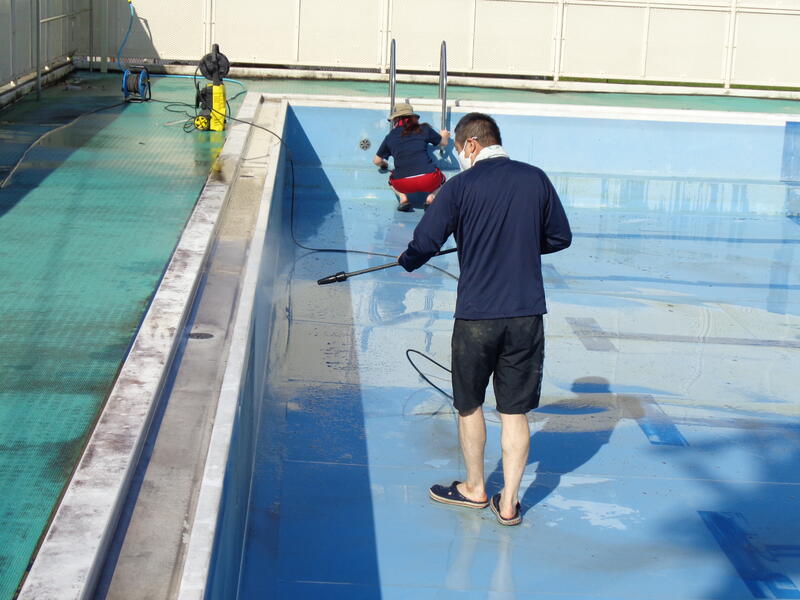 午前7時から本年度第1回目の奉仕作業でプール清掃を行いました。