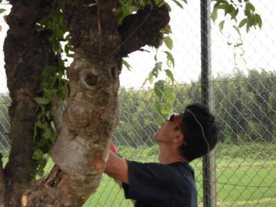 子供たちの目の高さに枝がこないように、学校周辺の道路状況が分かるようにと、毎日のように作業着に着替え、高枝ばさみやのこぎりで、ばっさばっさと枝を切り落としていきます。その姿はまさに職人。